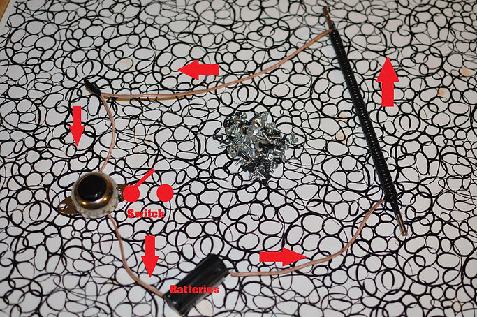 Now we need to connect the batteries and the switch to your wires at either end of the iron rod. This makes a circuit. When the switch is off the circuit is open and the electromagnet is off. When the switch is on the circuit is closed and the electromagnet is on. The switch is important not only so you can turn on and off the electromagnet but also because the batteries will get VERY hot if the circuit is left closed for too long and could explode. So be careful when playing with your electromagnet and give your batteries time to cool down. Follow the diagram below when wiring your circuit.